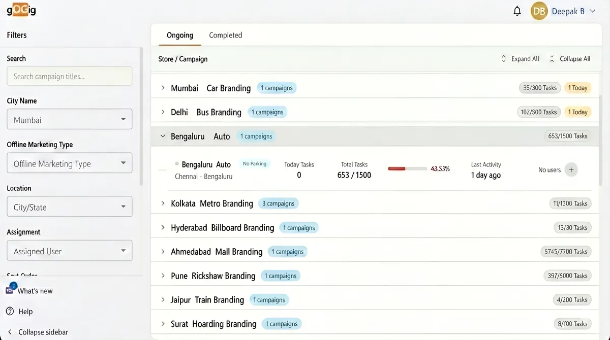 Track hoardings, auto branding, cab branding, wall paintings, society branding, POSM, street furniture, and retail installations, all from one unified platform.